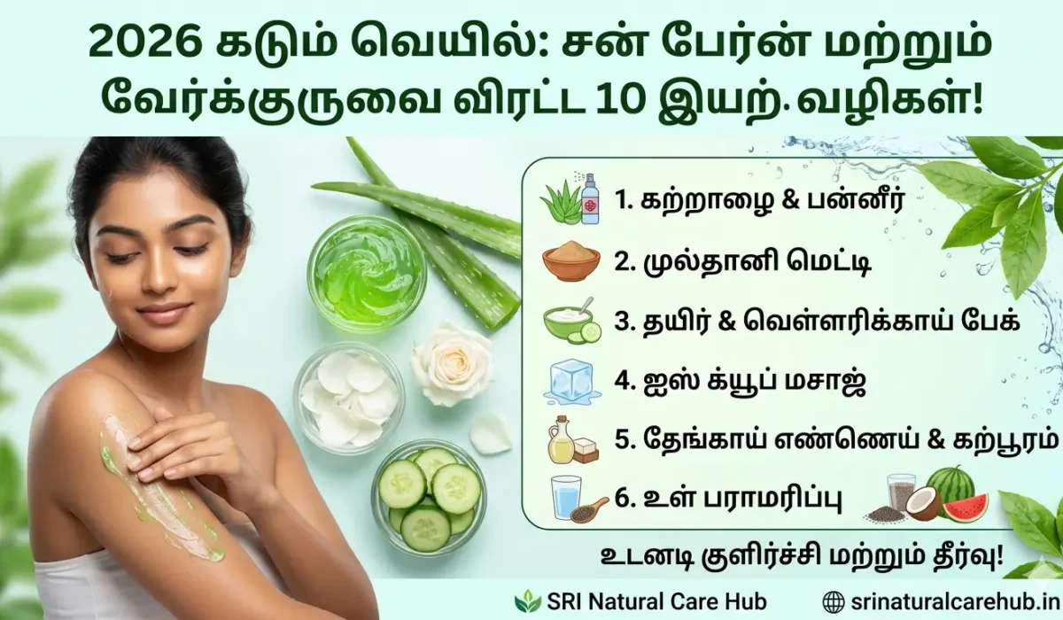 2026-ஆம் ஆண்டின் கோடை வெயில் முன்பை விட மிகக் கடுமையாக இருக்கிறது. இதன் காரணமாக, வெளியில் சென்று வரும் பலருக்கும் சருமத்தில் எரிச்சல், சன் பேர்ன் (Sunburn) மற்றும் வேர்க்குரு (Prickly Heat) போன்ற பிரச்சினைகள் ஏற்படுகின்றன. இருப்பினும், இந்த Sunburn treatment Tamil பகுதியில் உங்கள் வீட்டிலேயே இருக்கும் சில எளிய பொருட்களைக் கொண்டே இந்தப் பிரச்சினைகளில் இருந்து உடனடித் தீர்வு பெற முடியும். வாருங்கள் அதைப் பற்றி பார்ப்போம்.